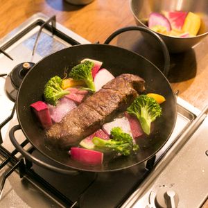 それだけでなく、オーブンに入れたりキャンプに持っていったり、シーンを選ばない機動力の高さも特徴です。食卓にそのままサーブしても見栄えがするので、「作る」から「食べる」へとスムーズに切り替えられますよ。ちなみに、熱伝導性が高いので、火にかけると持ち手の部分まで熱くなります。調理後に持ち手を持つときは、ミトンやふきんを使用してください。