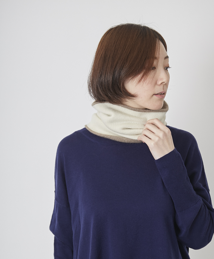 実はこのスヌードは、ニット工場が最も空いている今年の年始に作られたもの。特価でベビーカシミヤを調達し、閑散期に製品化できたからこその価格で、通常は14,000円以上になるところだそうです。