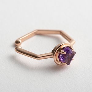 イヤーカフとしてだけではなく、ピンキーリングとしても使える2WAYタイプのこちら。六角形のリングの先端の丸い台座には、細かくカッティングされた四角い天然石アメシストが付いています。