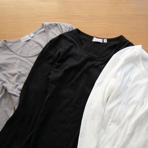 クルーネックは、鎖骨がちらっと除く程度に開いています。上にニットやシャツを着た時に、襟ぐりからインナーがのぞかない絶妙な開きだと思います。