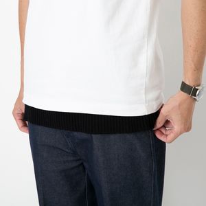 お腹部分は着ぶくれしないように薄手にして、裾部分は編み方を変えてリブ編みにしています。裾の部分の糸の本数を増やして肉厚にすることで、腰回りからヒップのシルエットがはっきりと出ないようにしているんです。