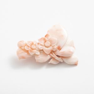 こちらでご紹介するのは、高知県で昭和中期に珊瑚専門の職人によって見事な彫りが施された、宝石珊瑚のブローチです。現存する珊瑚を彫ることのできる職人は今やほんの数名だそう。珊瑚そのものの希少性と相まって、同じものを制作しようとしたら、販売価格は約3倍になると言われるほど貴重なブローチです。すべて1点ものとなり、同じものの再入荷はありません。