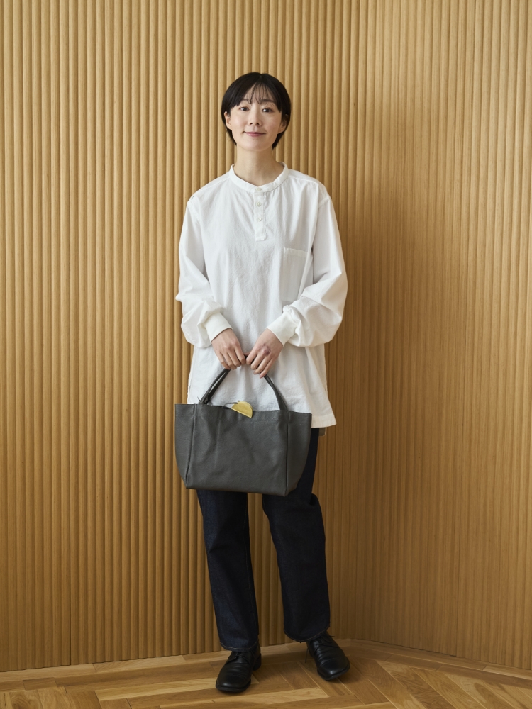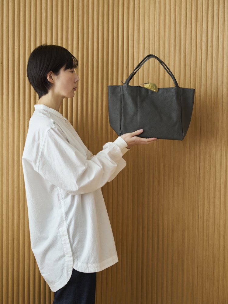 革物作家の園田さんが手掛けるブランド、sonor(ソナー)の数あるラインナップの中で、最もポピュラーなのが、ARAI CORONと名付けられたシリーズです。使いやすい革のトートバッグはめずらしくありませんが、sonorのものは、独特な風合い、なかなか見かけないニュアンスのある色味、オリジナルの真鍮パーツ付きと、特別感を感じる要素が詰まった一品です。