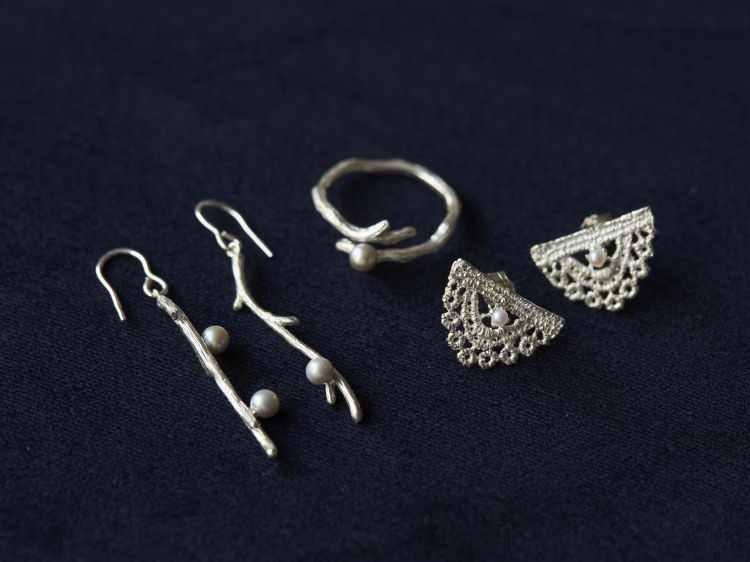 ゆっくり火加減を見ながら、温度を生地ごとに変え、丁寧な手作業でボリュームを調節することにより、少しずつ美しく繊細な模様が浮き上がります。そのため大量生産には向かないのですね。手作業で丁寧に制作されたアクセサリーは、手編みのレースの自然な糸の線が忠実に再現され、その少しポコポコした感じが何とも良い風合いです。