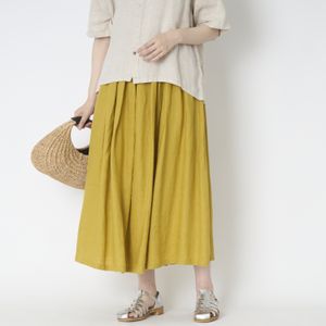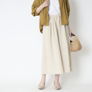 スカート丈は84.5cmで、ウエストがゴム仕様になっているので、丈感を手軽に微調節できます。サンダルやスニーカーを履く日は丈感を短めに。ヒールのあるパンプスを履く日はロング丈になど、その日のコーディネートに合わせて調節しながら着用できます。