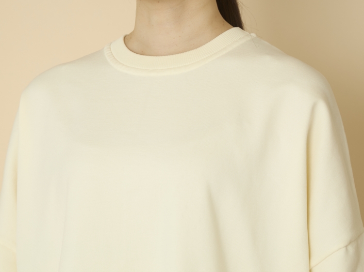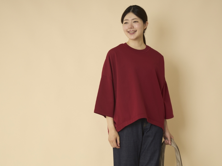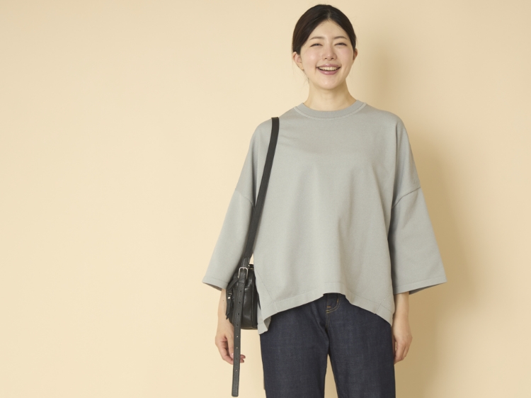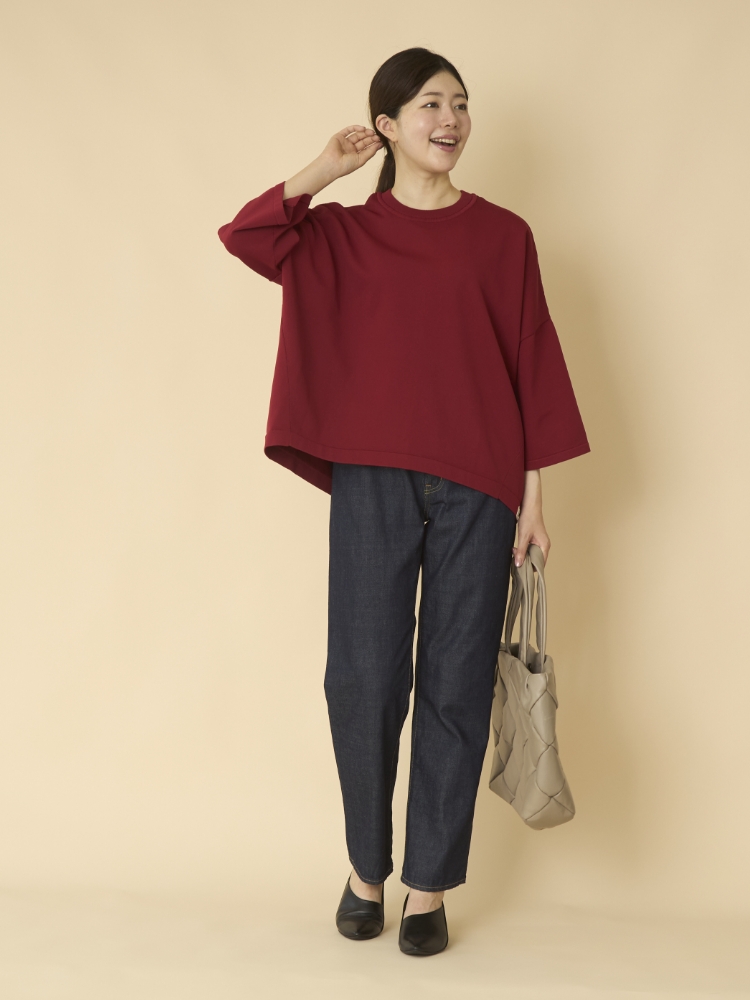 こちらのプルオーバーニットはゆったりした身幅ですが、裾に向かってなだらかにすぼまる特徴的なシルエットですっきり見えます。