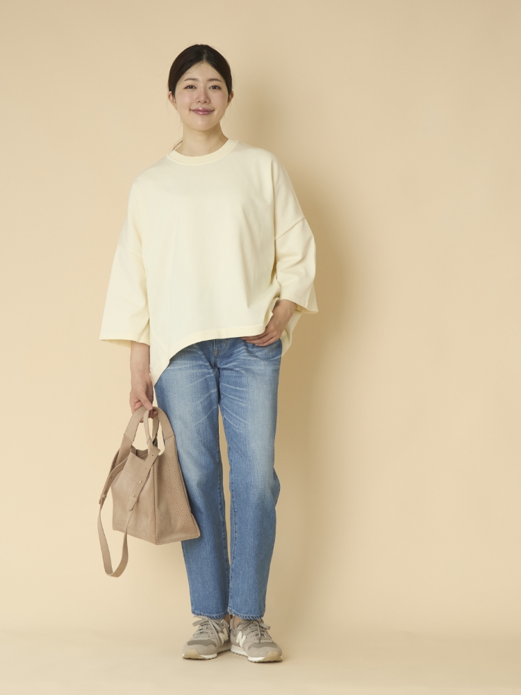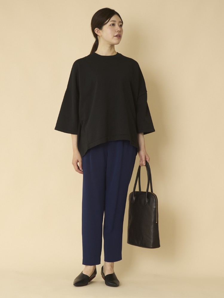 ゆとりのある身幅ですが裾に向かってなだらかにすぼまっていくので、気になるお腹周りや腰回りをカバーしつつすっきり見えます。
