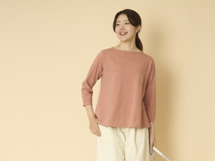 少しだけ襟ぐりを立ち上げることで、首との間にわずかな隙間ができ、首がすっきりして見えるのがいいところ。襟ぐりは絶妙な開き具合なので、前かがみになっても、胸元ががばっと開くこともありません。
