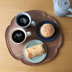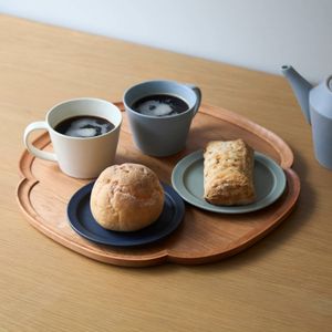 天然木で作られた、iwakaguの木瓜型トレー。小と大の2種類からお選びいただけて、小サイズはカップ2つとティーポット、大サイズはコーヒーとデザートを2人分、カップなら4人分が目安です。