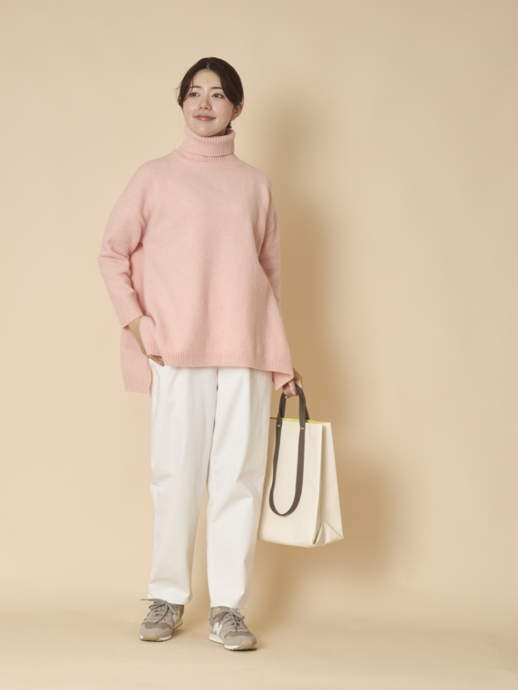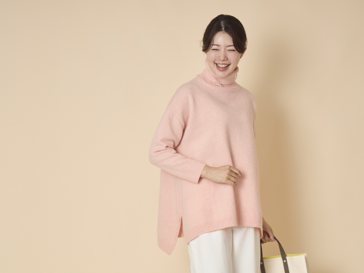 ウールは重いというイメージがありますが、タスマニアラムウールはふっくらと暖かいのに軽いため、肩凝り知らず。ゆったりとしたタートルネックで、首回りも寒くありません。