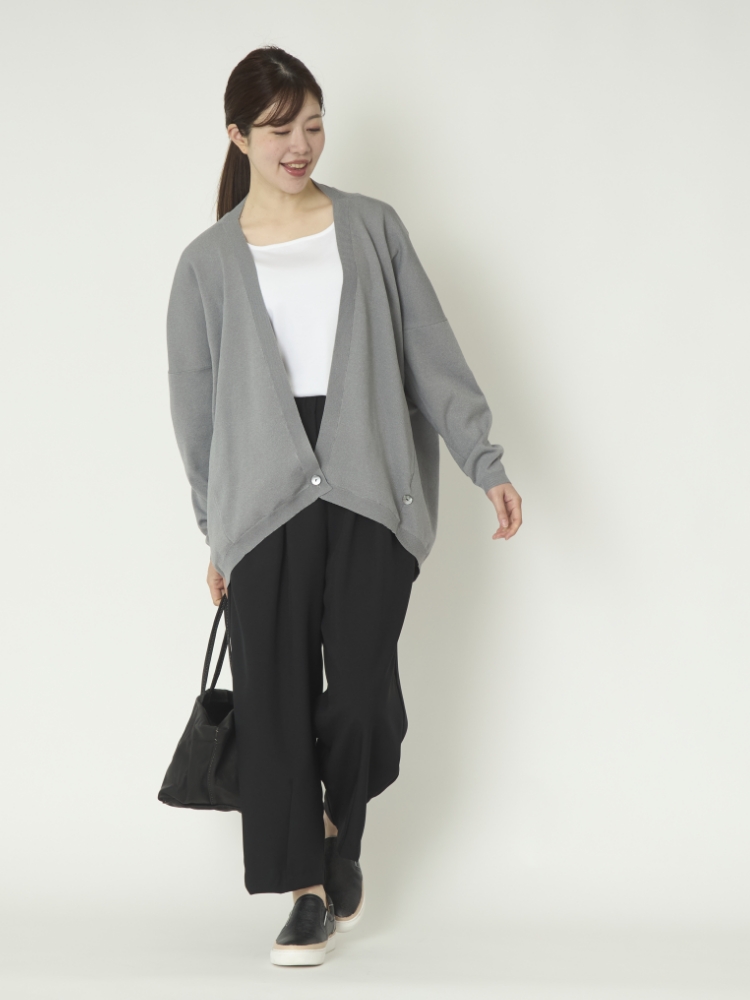 Lelillの「ハイテクボレロ」は、ゆとりのあるデザインで、ゆったりしたトップスや厚みのあるニット、カットソーなどにも重ねやすい仕様。それでいて、前後差のある着丈やVネックの襟元がすっきりした印象を与えてくれるため、さまざまなスタイリングに活躍します。