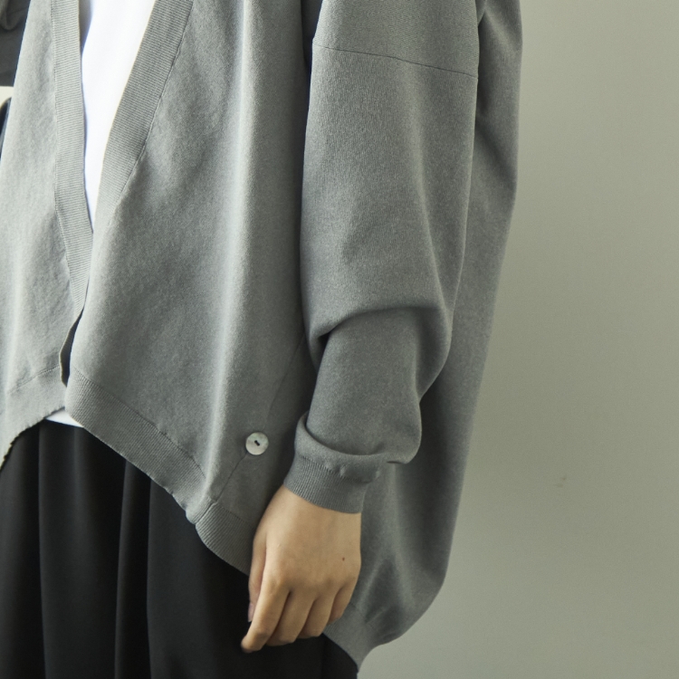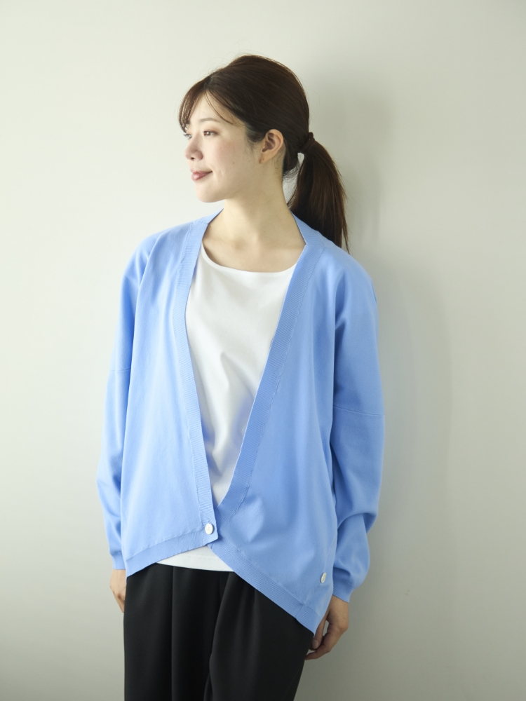 1枚で色々な着こなしができるのもポイントです。ただ羽織るとボレロのように、裾のボタンをシングルで留めるとVネックに、2つとも留めるとカシュクール風にと3通りの着方ができます。着回しの効く羽織りが見つからないときは、ぜひ手にとっていただきたい一品です。
