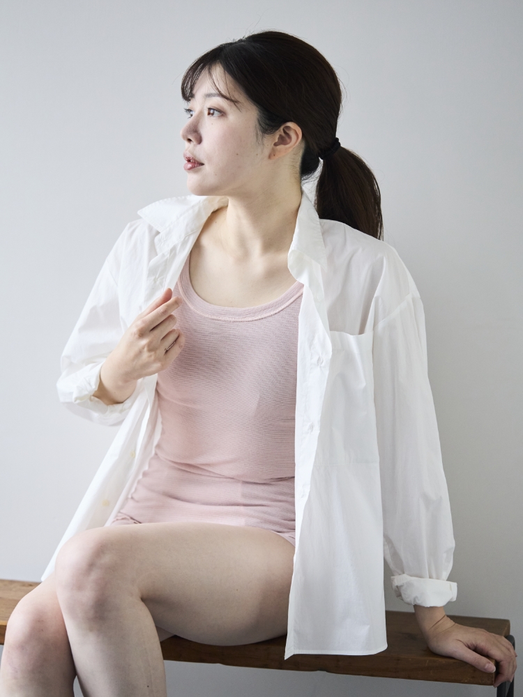 日本に3台しかない古い編み機でゆっくりと時間をかけて編み立てたガーゼのインナーは、締め付け感が一切ありません。不快感を感じやすい大人の女性の肌を快適に保ち、ストレスフリーなインナーは、まさに思いやりで包まれていることを実感できる一着だと思います。