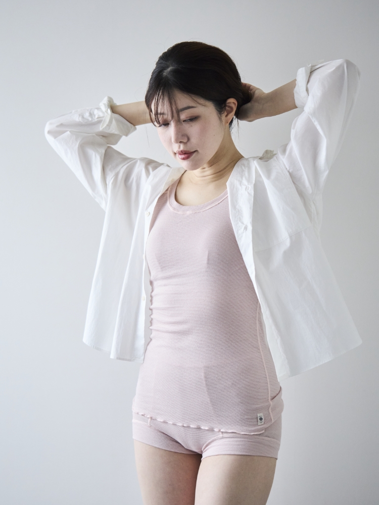 日本に3台しかない古い編み機でゆっくりと時間をかけて編み立てたガーゼのインナーは、締め付け感が一切ありません。不快感を感じやすい大人の女性の肌を快適に保ち、ストレスフリーなインナーは、まさに思いやりで包まれていることを実感できる一着だと思います。