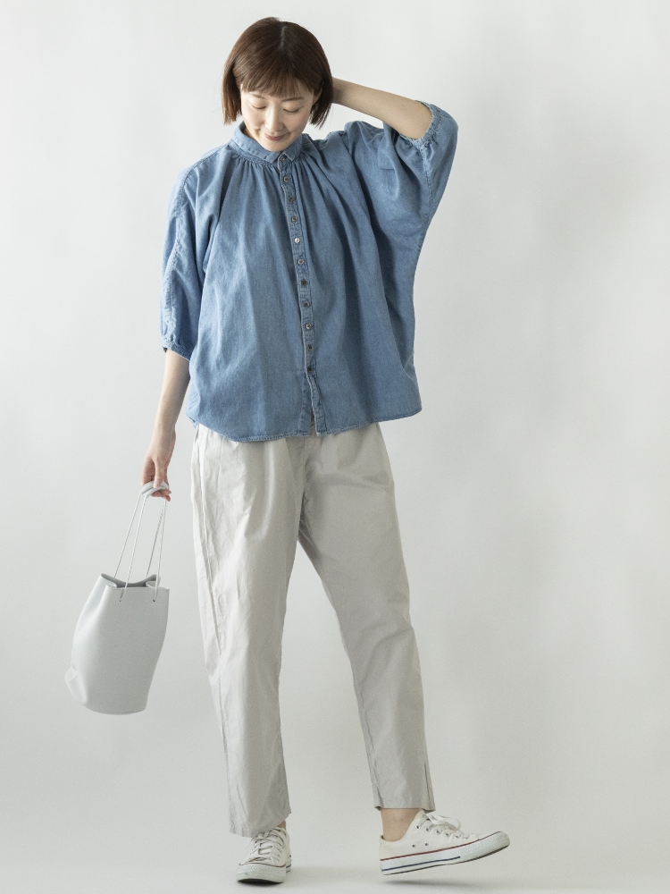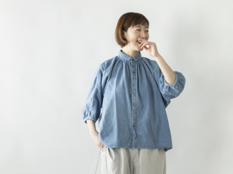 Brocante/グランシャツデニム ユーズド 細かいギャザーがたっぷり入って、ゆったりなのにすっきり見える優秀シャツ