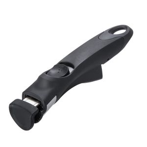 取っ手は別売りです。鍋の縁にセットして、裏側を握ればホールドされ、取っ手上部のボタンを手前にスライドすれば、簡単に外れます。フライパンをしっかりとホールドしてくれて、安定感のある使い心地。手のひらで包んだ時に握りやすい形をしています。