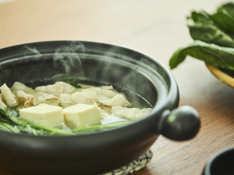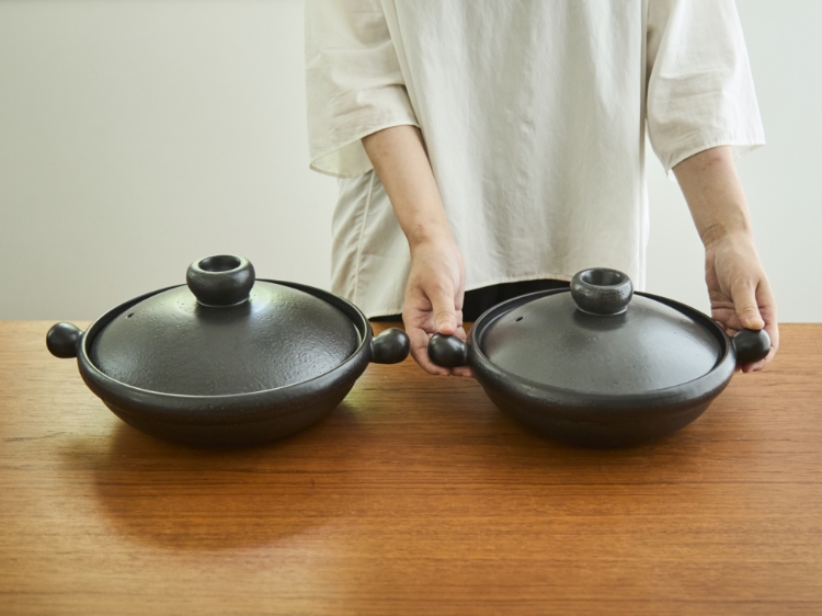 こちらが作られた背景には、弥生陶園・代表の久志本さんの「お酒を飲みながらゆっくりお鍋をつつきたい」というお酒好きならではの理想があります。だからこそ「もし途中で冷めても、火にかければすぐに熱々になるように」「具材を新しく足してもすぐに煮えるように」と考えられた浅鍋であるのが最大の特徴です。同じサイズの他の土鍋と比べると深さがない分、火の通りが早く短時間で具材があたたまります。