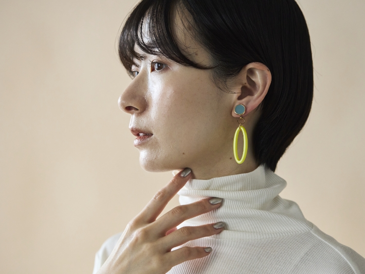 こちらのイヤリングのもうひとつの特徴は、2way仕様になっていて様々なシーンに応じてアレンジができること。アクリルパーツ部分が取り外せるようになっているんです。エナメルだけでつけるとシンプルで上品な印象になり、お仕事や少しフォーマルなシーンにもぴったりです。