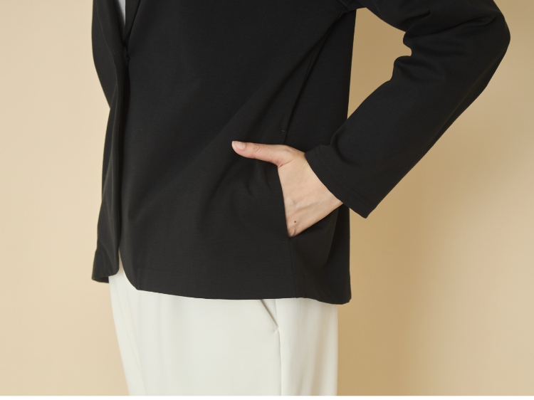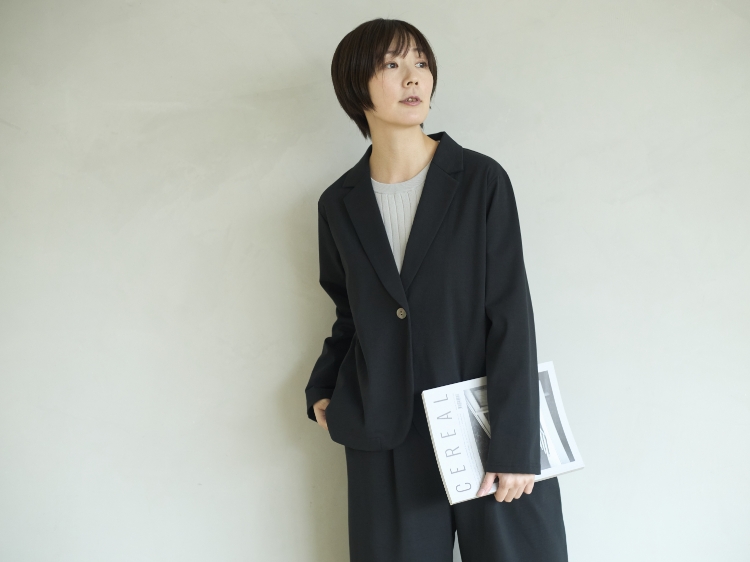 シンプルな一つボタンのテーラードジャケットは、かつてスーツに定評のあるブランドで勤務していたバイヤー自身の経験から、着心地にこだわっています。