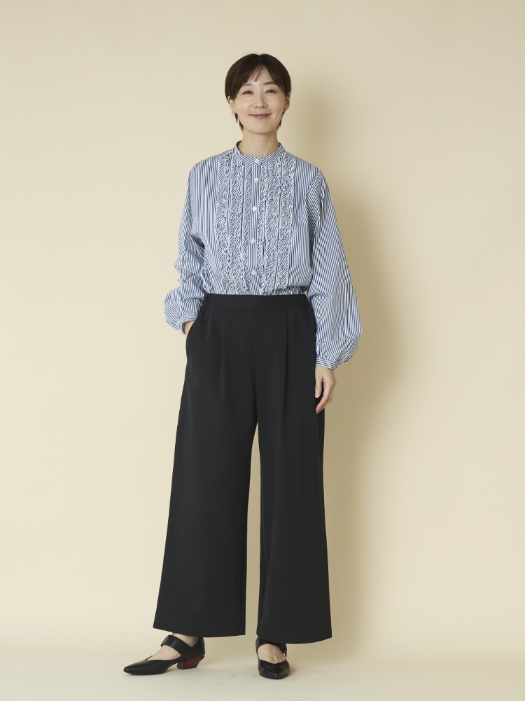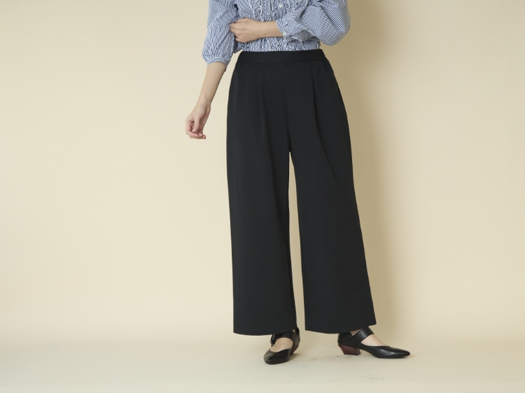 ウエストにタックが入った、セミワイドの体のラインを拾わないパンツです。