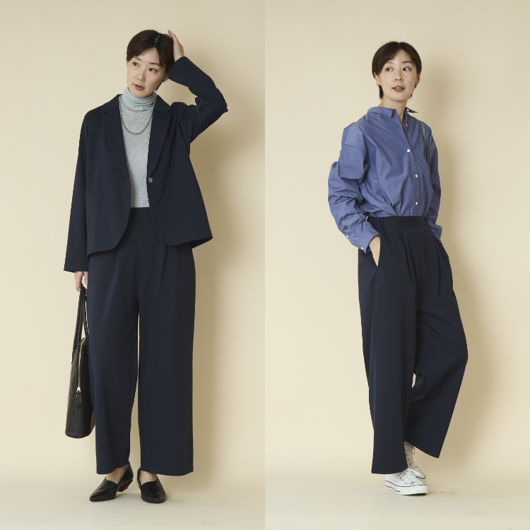 お揃いのジャケットと合わせればオンタイムのきちんとした装いに、スニーカーと合わせれば休日のリラックスした装いにと、かっちりとしたコーディネートはもちろん、少し着崩した着こなしもカジュアルになりすぎません。