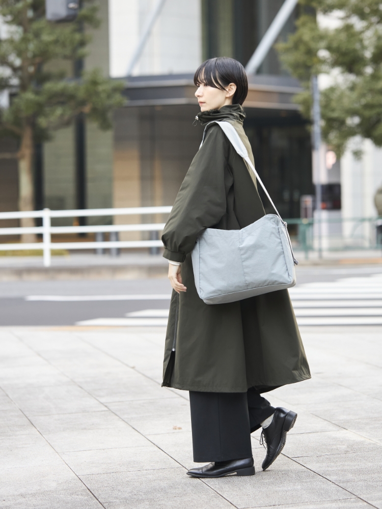 出張など、きちんとした装いにも合わせやすいよう、ナイロン製でありながら、きれい目な印象であることもポイント。ニュートラルグレイの女性デザイナーさんにお願いし、1-2泊分の荷物をなるべくコンパクトに、身体に負担なく持てるよう、そしてステンカラーのコートにも似合うイメージでデザインしていただきました。
