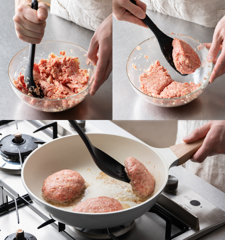また、ハンバーグを作る時に、ひき肉をこねる、形をつくる、焼いてひっくり返す、という動作をこれひとつでまかなうこともでき、手をべとべとにすることなく一連の動作が完結します。