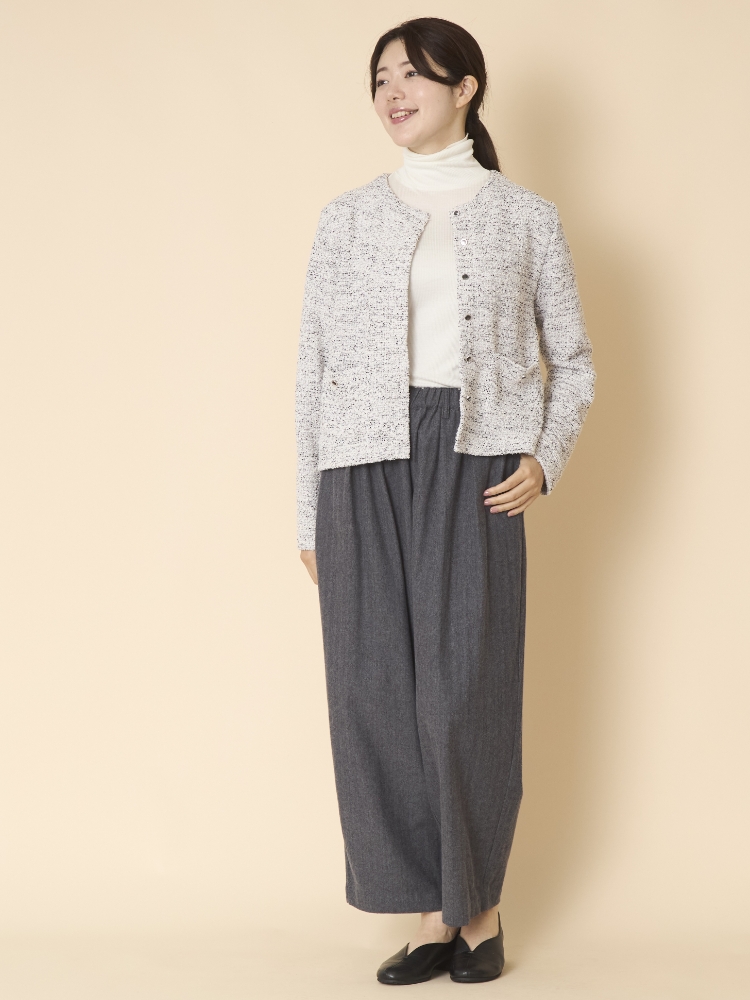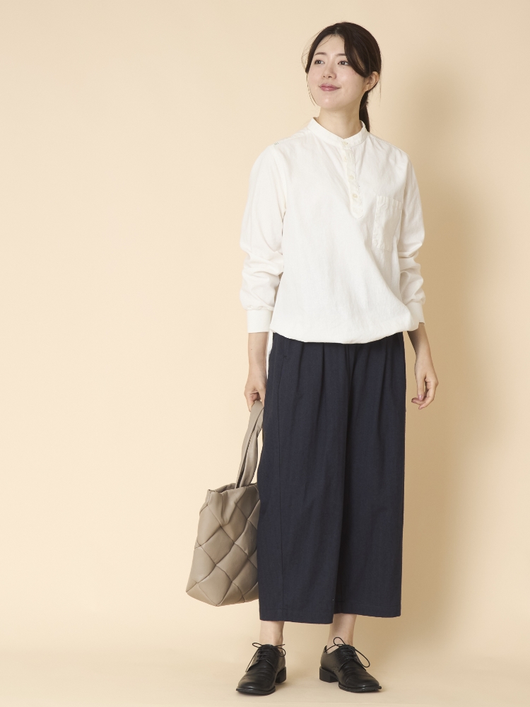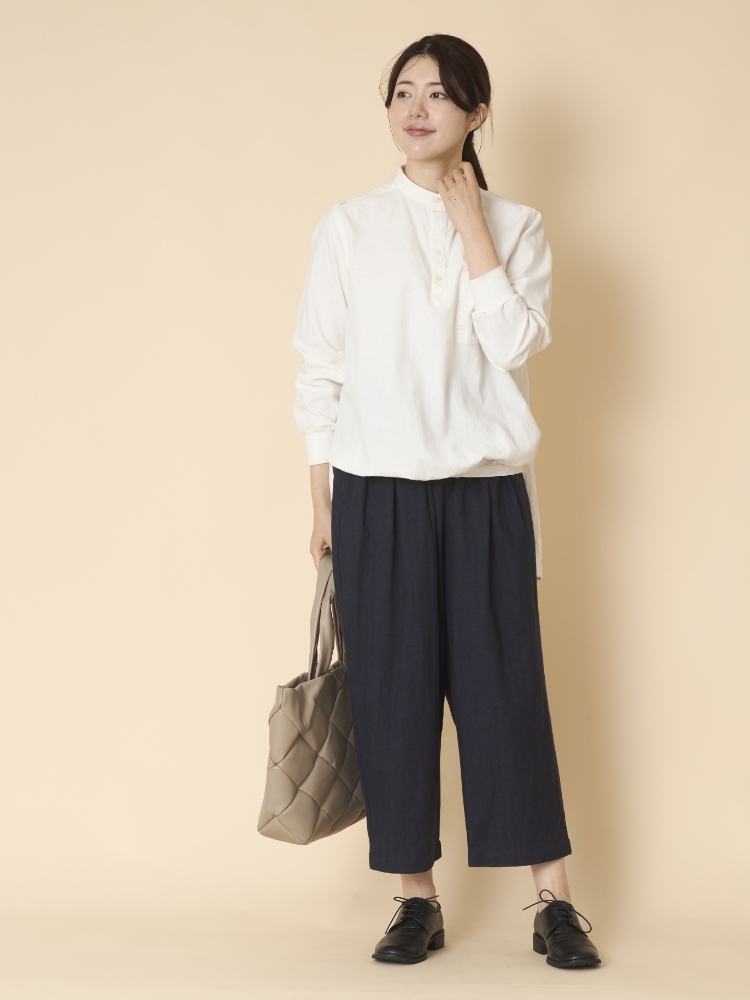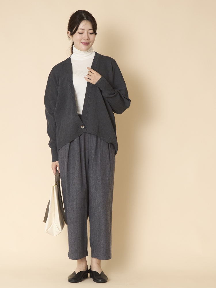 「丈の選べるコットンへリンボンパンツ」は、パンツ選びの「横で合わせると縦が合わない」問題を、縦に注目したサイズ展開で解決します。横は、ゆったりとしたデザインとウエストのゴム仕様で融通が利くので、逆に「縦は良くても横がダメ」ということにもなりません。そして体に合うから、バランスの良い着こなしも叶います。これまで「似合うパンツがない、上手く着こなせない」と諦めていた方にこそ、ぜひ捧げたい一品です。