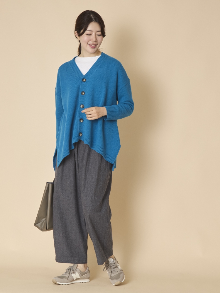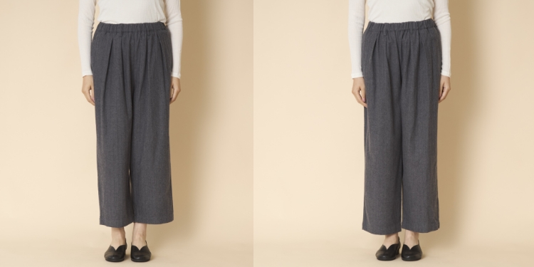 一方のウエスト部分はゆったりしていて、腰やヒップの気になる丸みを上手にカバーしてくれます。でもゆったりしてはいますが、ウエストのタックが美しい縦のドレープを作るので、ダボつくことなくすっきり見えるのも嬉しいところです。