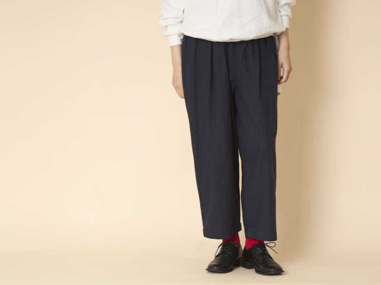 ワイドパンツは体型カバーがしやすいなど、そのボリューム感が良い仕事をします。しかしながら、低身長の方が着ると下半身に重さが出てしまう為、バランスが悪くなってしまったり、低身長が強調されてしまったりすることも。そこでこちらは、様々な身長の方にバランスよく穿いていただける「テーパード型」を採用しています。裾に向かってわずかに窄まっているから、重くなり過ぎる心配がありません。