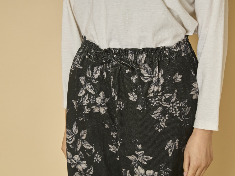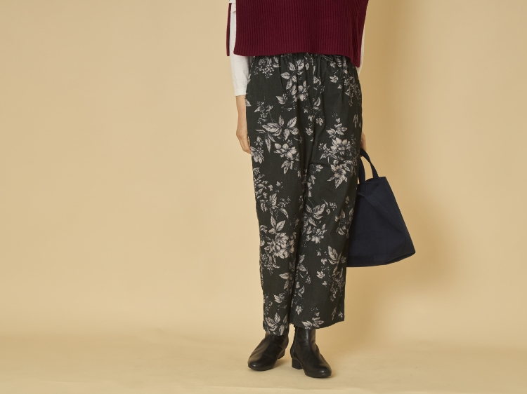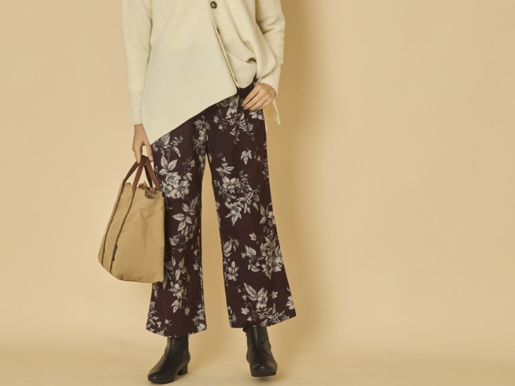 ところがこちらは、そうしたコーデュロイの印象を、畝を細くすることで払拭。プリーツのような軽さをもたせ、もたつき感や膨張感が抑えられています。そこにオリジナルのシックなボタニカル柄が加われば、カジュアル過ぎない大人な冬パンツの完成です。