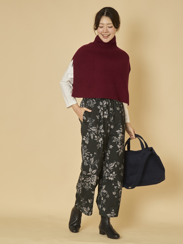 柄物のボトムスは着るだけで華やかな印象なので気になるけれど、着こなしが難しいのでは……と遠ざけてしまう方は多いかもしれません。TUTIE.(ツチエ)のコーデュロイフラワープリントパンツは、ブランドオリジナルの繊細かつシックなボタニカル柄。花柄との持つ甘さは控えめで、むしろ上品です。生地はあたたかみのあるコーデュロイですが、畝が細い為、すっきりと着こなすことができるのもいいところ。冬のお出かけ時についつい手に取ってしまう一着です。