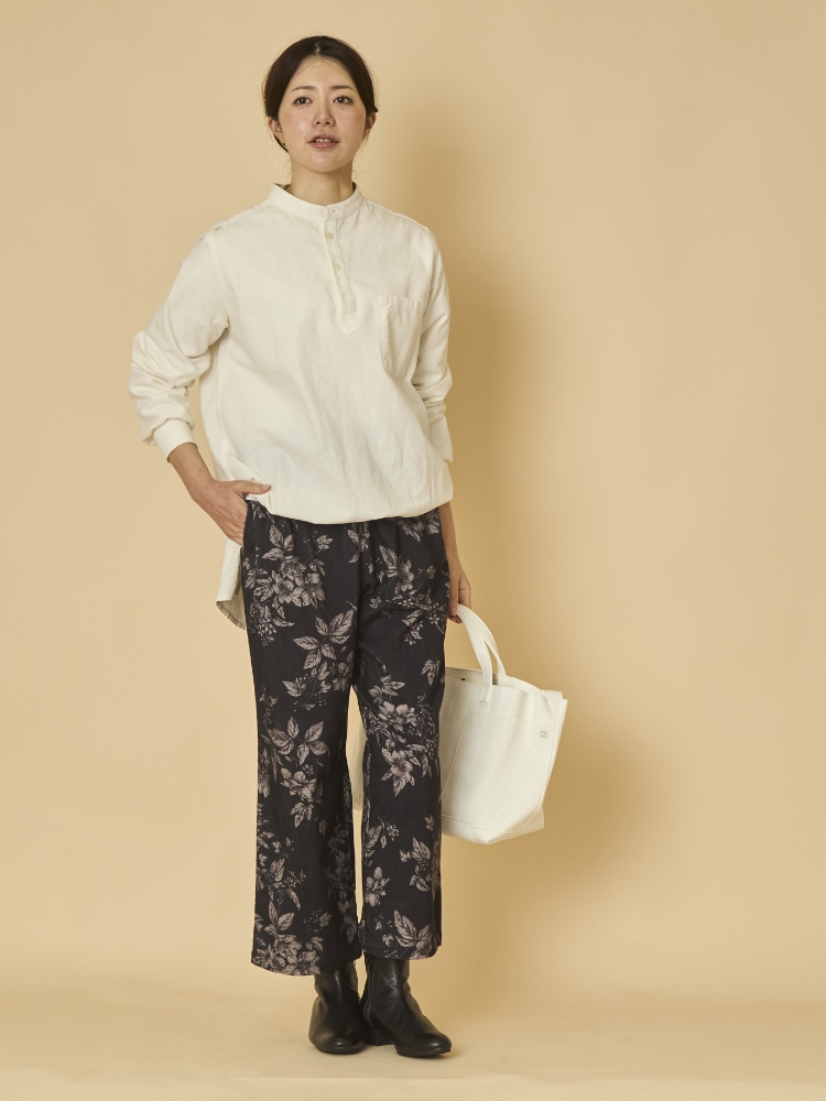 「コーデュロイフラワープリントパンツ」は、花柄の甘さ、コーデュロイのカジュアルさや重さ、ワイドパンツのコーディネートの難しさ、といったボトムスの様々な難問を気持ち良く解決してくれます。けれども決して無難に収まらないのが良いところ。気兼ねなく、シックで上品に他とちょっと差のつく装いを楽しませてくれる、気の利いた一品です。