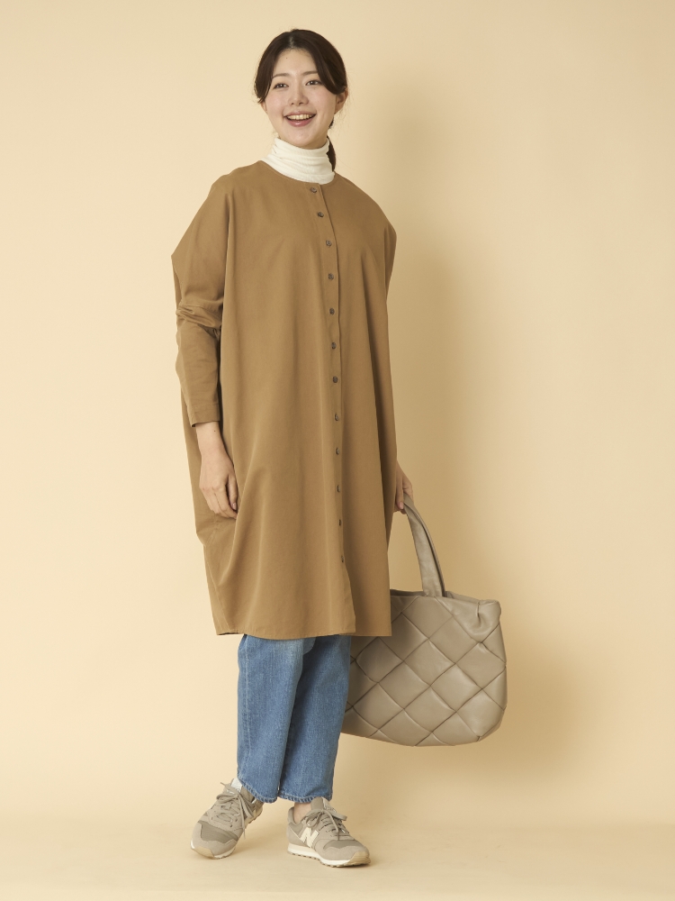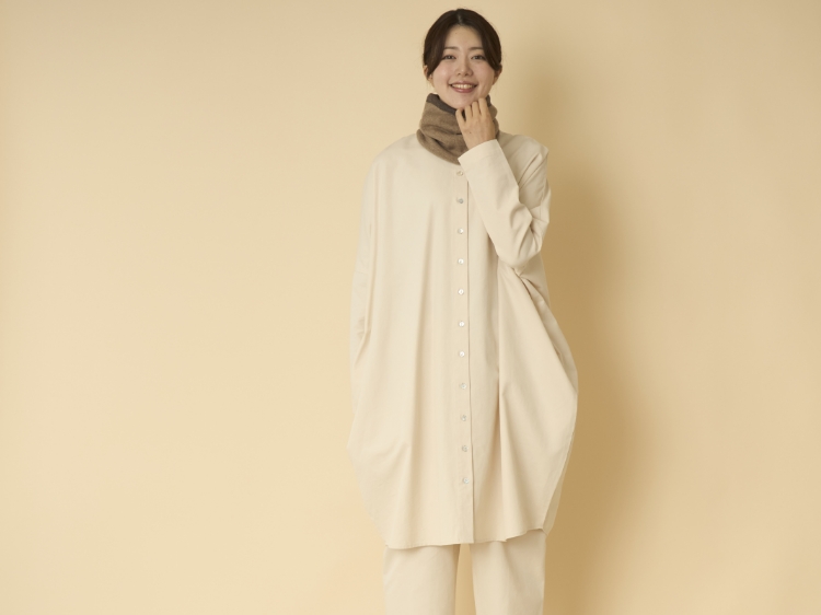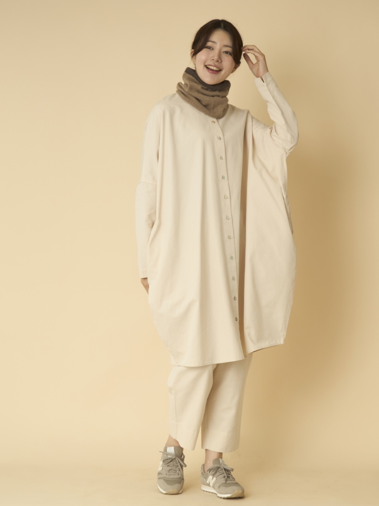裾に向かってわずかにすぼまるコクーン型のチュニックは、着丈が100cm。身長163cmの方で膝丈の長さです。ワンピースだと椅子に座ったときに裾が地面についてしまったり、階段を降りるときに裾を踏みそうになったり、色々とお悩みがつきものですが、チュニック丈だと裾さばきがいいので、動きやすいのが魅力です。