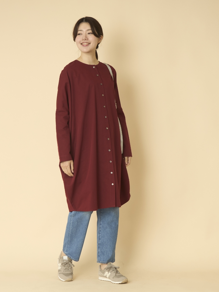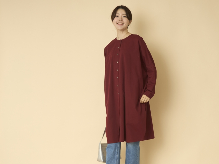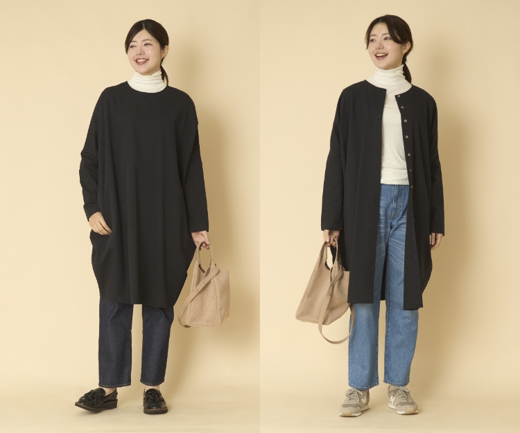 昼夜の寒暖差の激しい季節は、羽織として使える前開きのアイテムがあると便利です。こちらは前後どちらを前にしても着られる2way仕様なので、クルーネックのチュニックとして、ロング丈の羽織としてと用途に合わせて着られます。