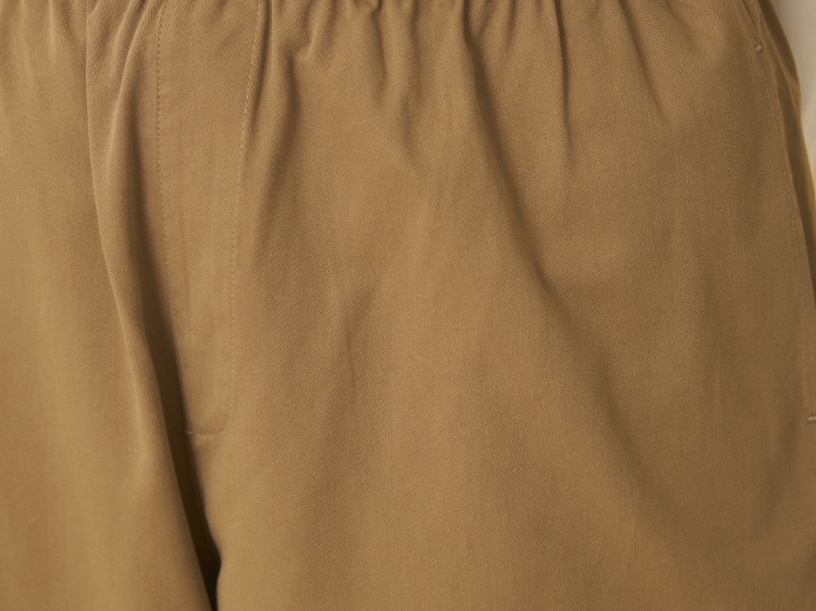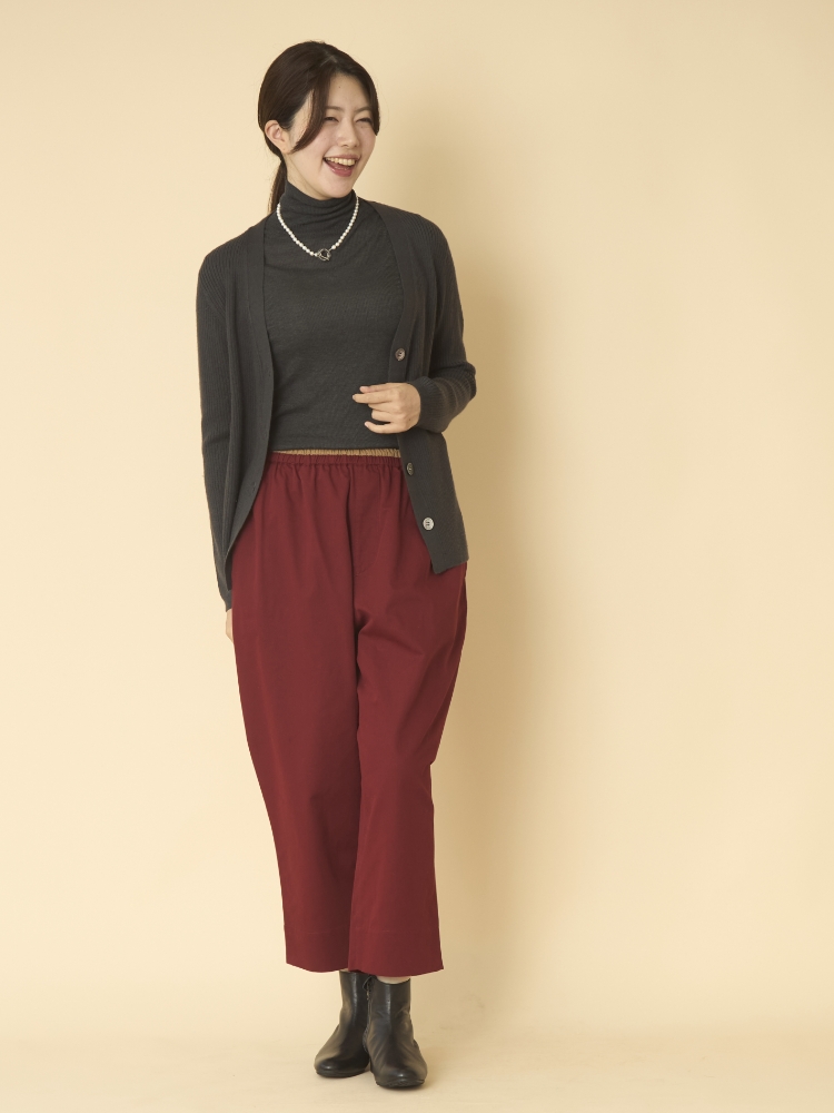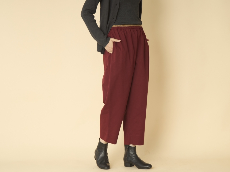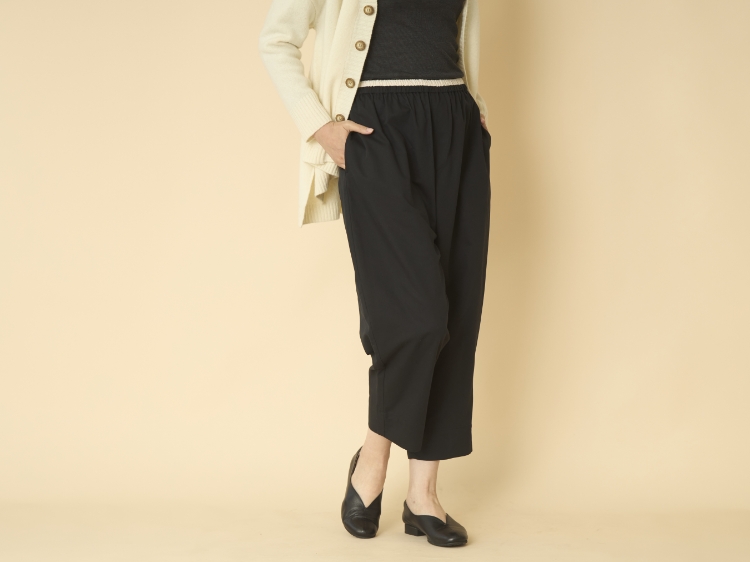 ウエストゴムのパンツのもうひとつの魅力は、パンツの丈を微調節できること。ウエストのくびれ部分で留めたり、腰部分で留めたりなど調節できるので、その日のコーディネートに合わせて丈感を変えられるんです。チュニックなどバランスが難しいと思われるアイテムとも相性がいいと思います。