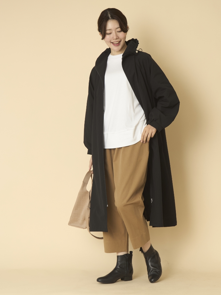 寒い時期にぴったりな暖かい生地の服がほしいけど、着膨れするのは避けたい、という方におすすめのアイテムがTUTIE.(ツチエ)から届きました。こちらはピーチ加工を施したパンツで、微起毛による温かみがありながら落ち感があるので、太って見えないのがいいところ。ウエストがゴム仕様ですが、配色になっていてデザインにポイントがあるので、チラ見えしてもラフさがなく、サマになるのがいいところです。