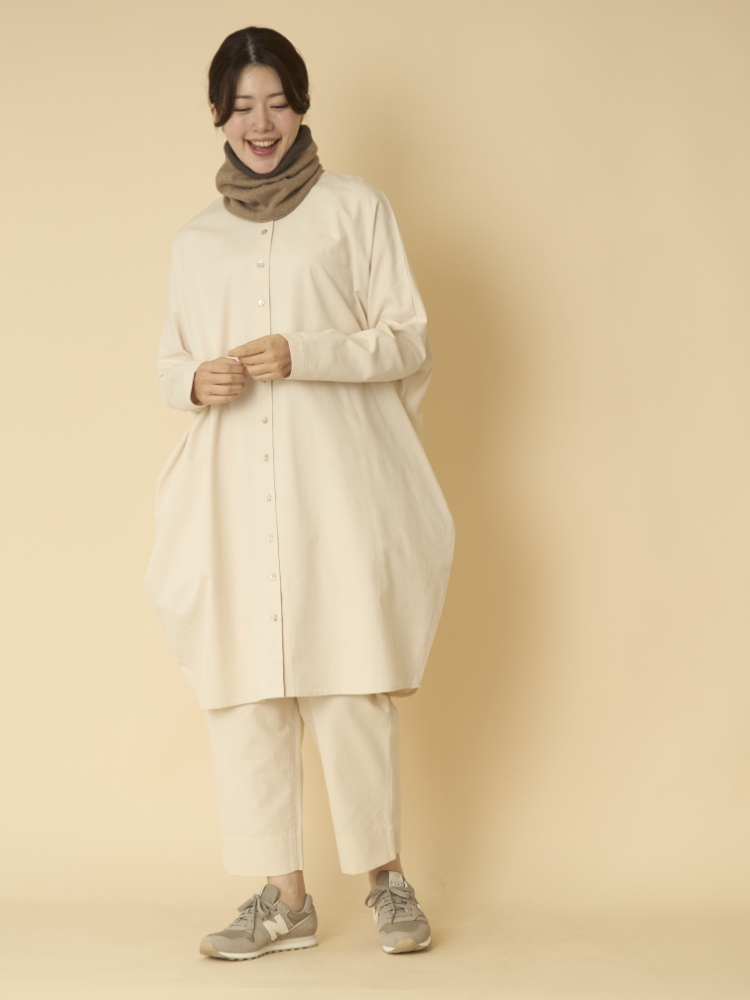 中肉厚な生地はしっとりとしていて落ち感があるので、ゆったりしていますが、太って見えません。防寒の為のレギンスの重ね着による着膨れや、動きにくさが苦手な方におすすめです。