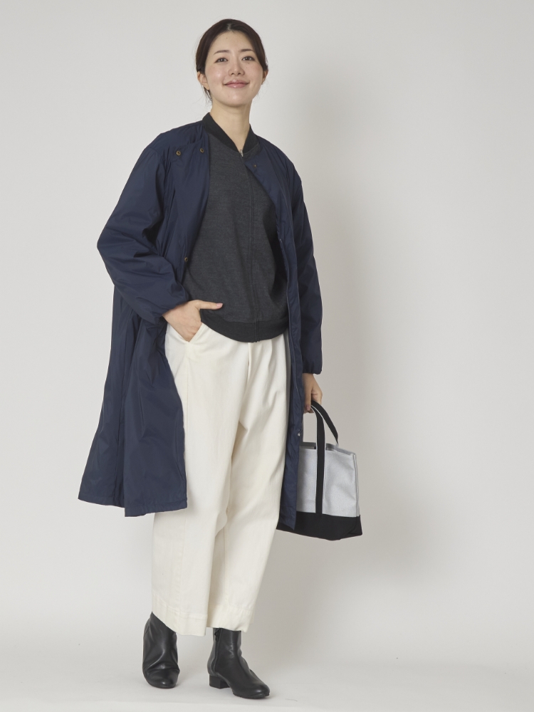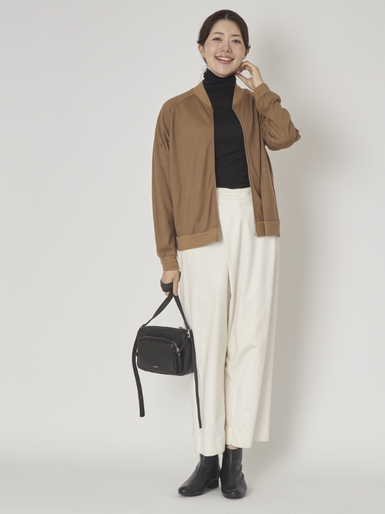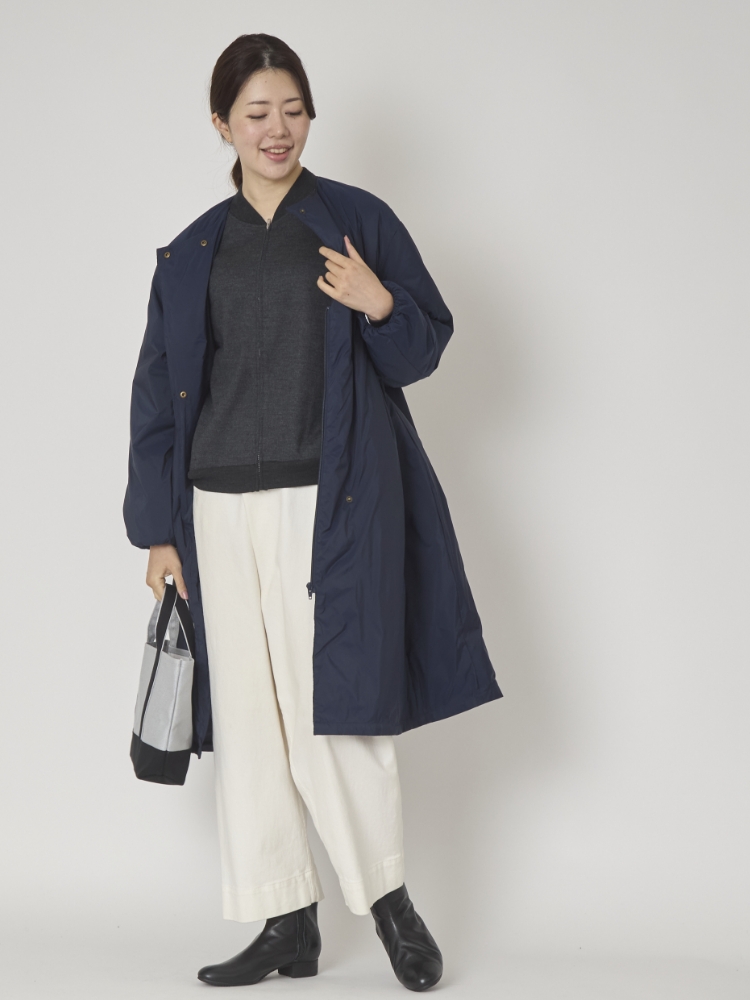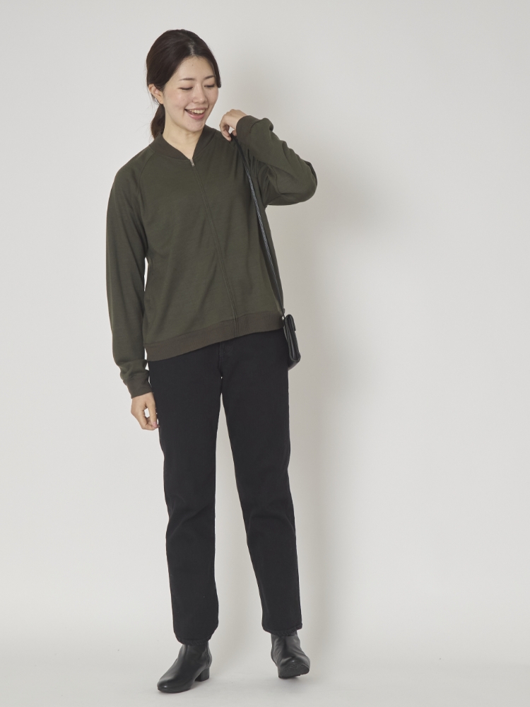 一般的なアウターだと、バストが120cmほどはありますが、こちらは110cm。ブルゾン見えしますが、中にたくさん着こむよりも、カーディガンのように軽い羽織りとしての用途がイメージしやすいと思います。