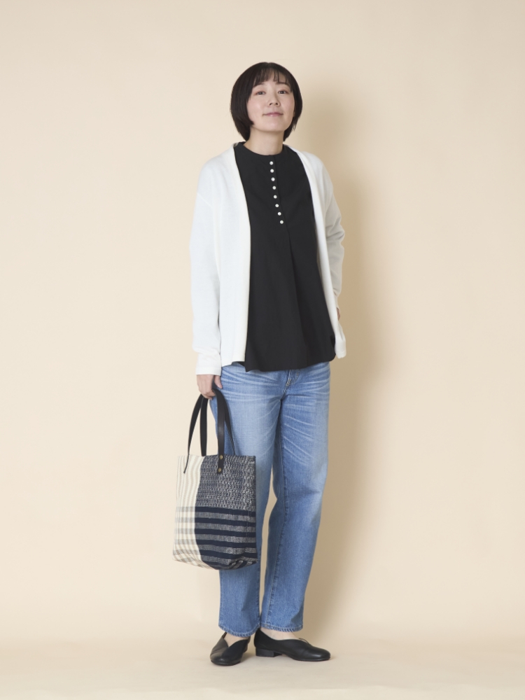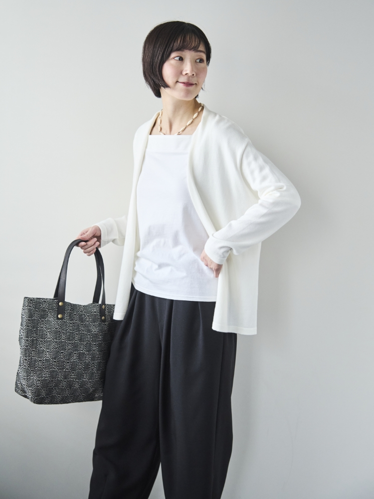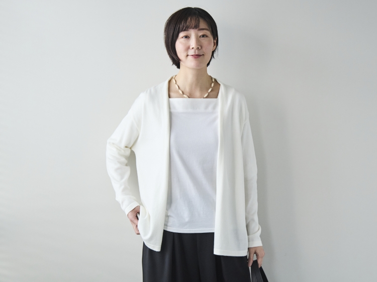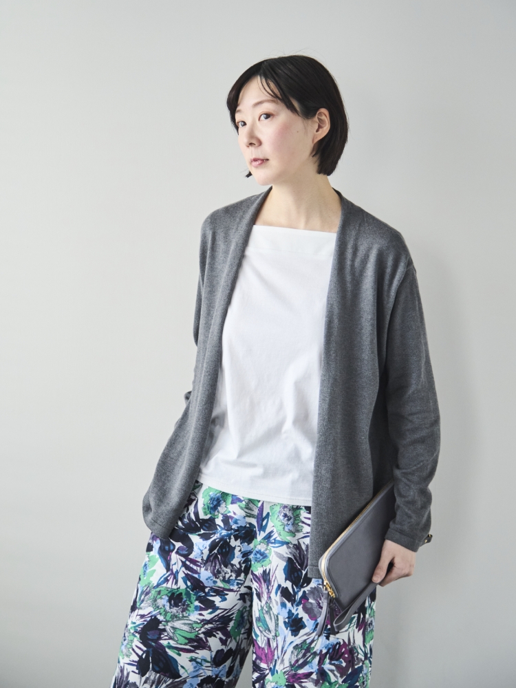 ニット素材で体にフィットするからこそ、カーディガンは実は肉感を拾いやすいアイテムです。シンプルなクルーネックのぴったりとしたカーディガンをボタンを留めて着るのは、年齢を重ねて丸みを帯びた体型にはハードルが高い……、けれども、ゆるっとしたシルエットはシーンによってはコーディネートが難しい。そこで、こちらは思い切ってボタンをなくしてさらりと羽織れるデザインにしました。