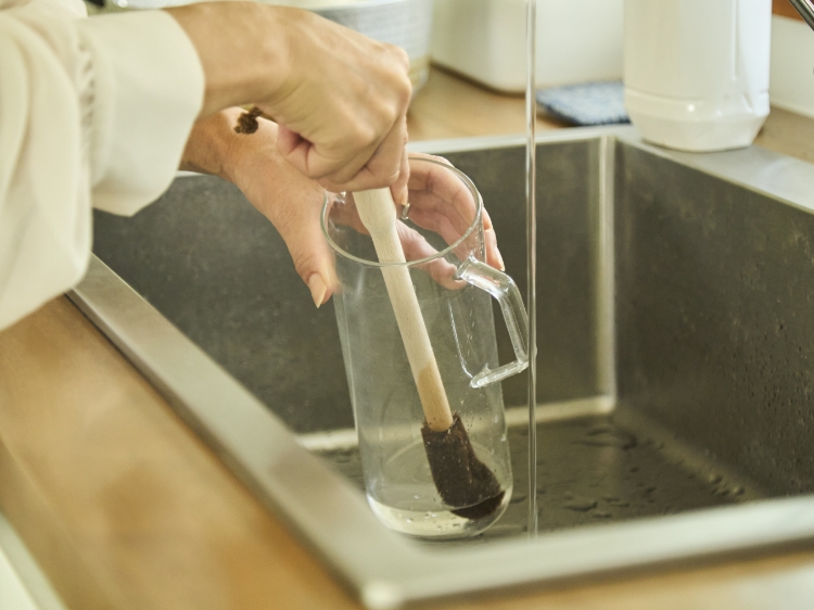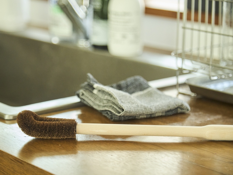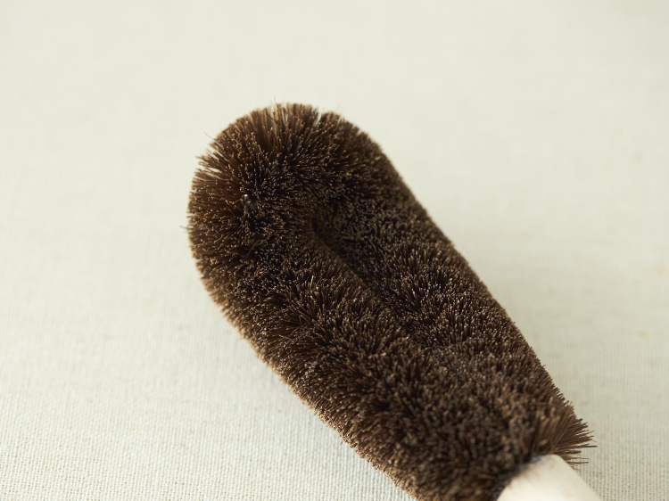 たわし部分に使われているのは、優しい肌触りと柔軟性を併せ持つ棕櫚(しゅろ)。コシの強さも特徴で、ガラスやコーティング加工されたステンレスボトルといった繊細な素材も傷つけにくいため、安心してお使いいただけます。