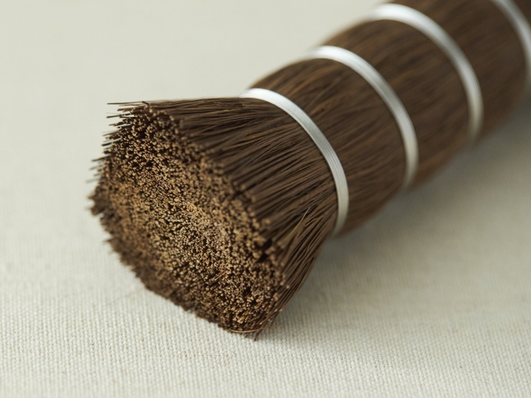 こちらは、ヤシ科の常緑高木である棕櫚(しゅろ)の幹から採れる繊維状の毛(棕櫚皮)を使用したささらです。柔らかくしなり、しっかりとしたコシもあるこの繊維を、ステンレス線を使った「綴り」と呼ばれる技法で束ねています。
