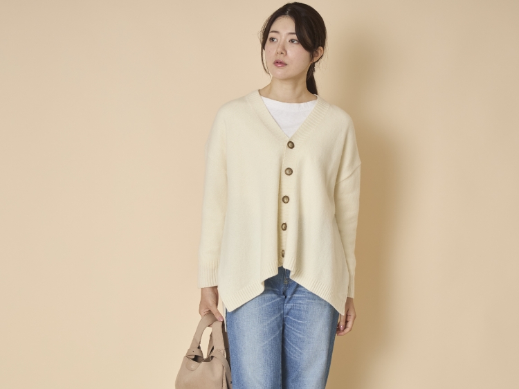 こちらのカーディガンのもうひとつの魅力は、ゆったりしたシルエットで体型をカバーできること。お腹周りの身幅がかなりゆったり目に作られており、さらに後ろ見頃だけ丈が長いため、気になるお尻周りをしっかり隠せます。Vネックなので、シャツ・クルーネック・タートルネックなどと合わせても、顔周りがもたついて見えることもなく、すっきりコーディネートできるんです。短すぎず長すぎずな丈感なので、パンツはもちろん、ふんわりしたスカートとも相性抜群です。