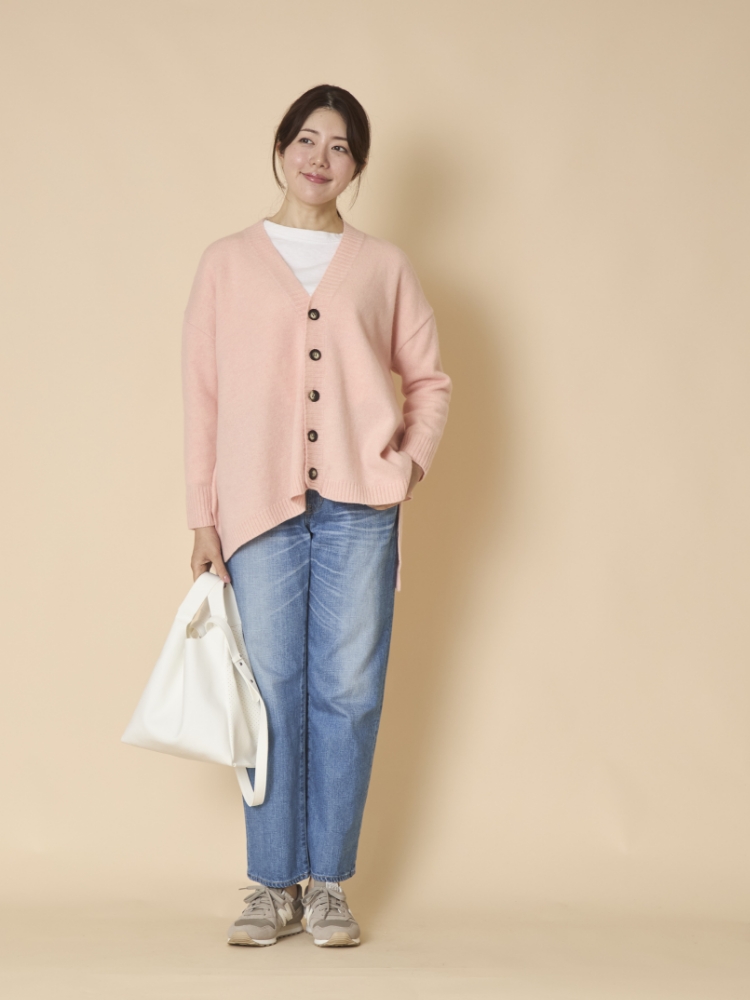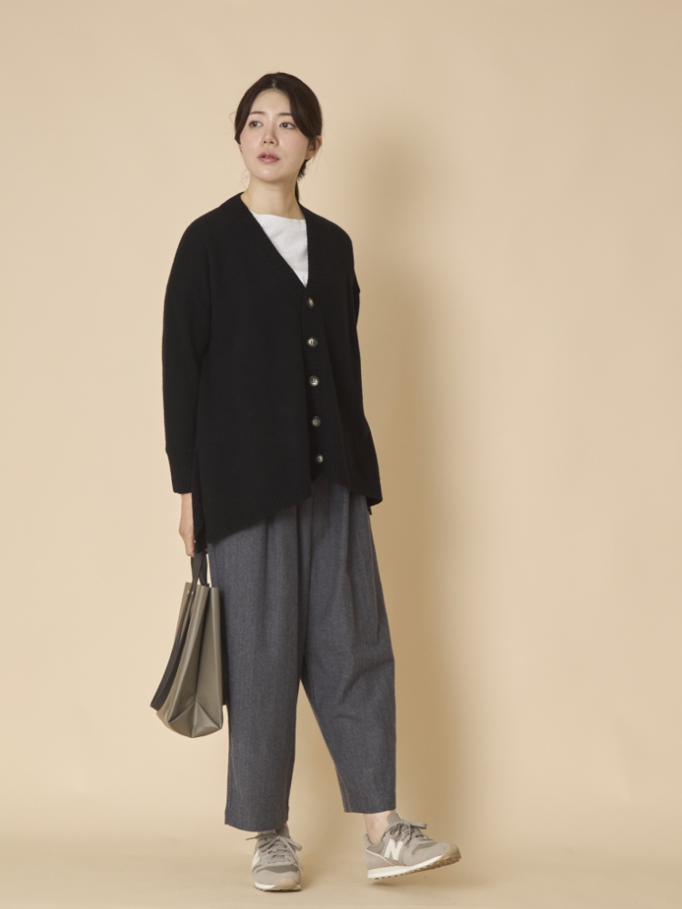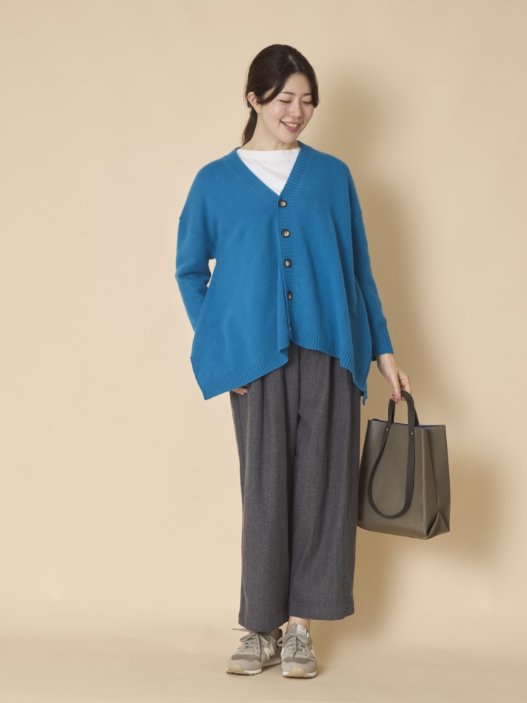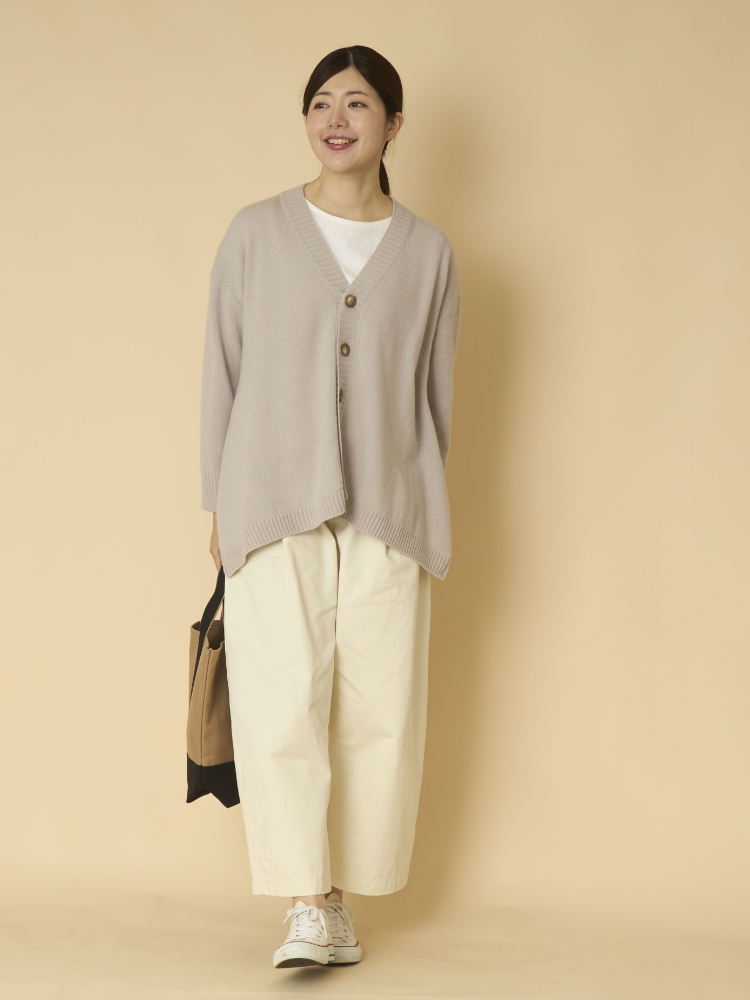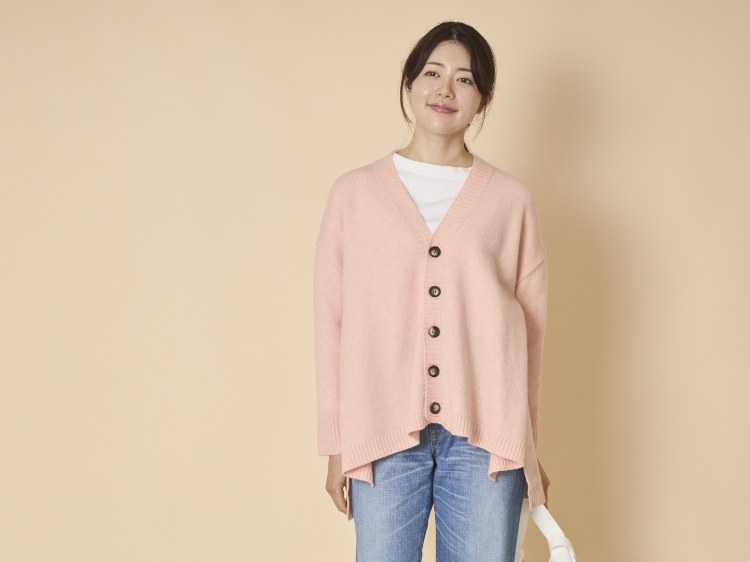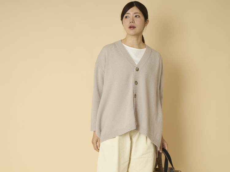 こちらのカーディガンはゆとりのあるシルエットで、脱ぎ着も簡単。少しゆったりしたブラウスやニットと合わせても、もたつく心配がありません。