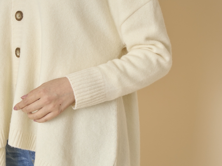 冬場は、厚手のニットやスウェットを着ることで肩が凝ってしまうという方も多いのではないでしょうか。こちらのカーディガンに使用されているタスマニアラムウールは、ふっくらしているのにとても軽く、肩が凝る心配がありません。