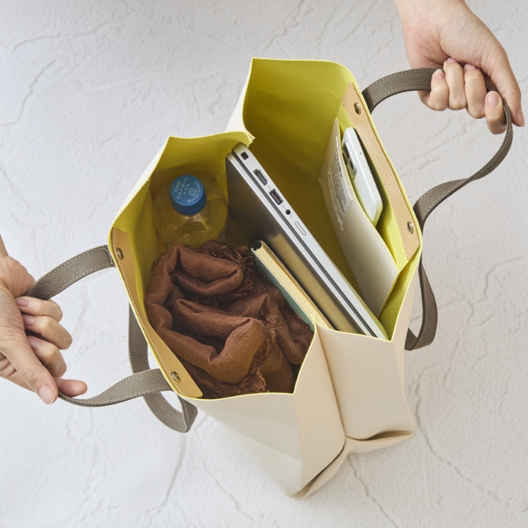 紙袋からインスパイアされた、A4サイズがすっぽり入る縦長のデザインもポイント。パソコンやタブレット、書類なども頭が出ずに収納できるので、普段使いはもちろんお仕事バッグにもぴったりです。マチもしっかりとっているので、お弁当箱など幅のあるものも無理なく収まります。