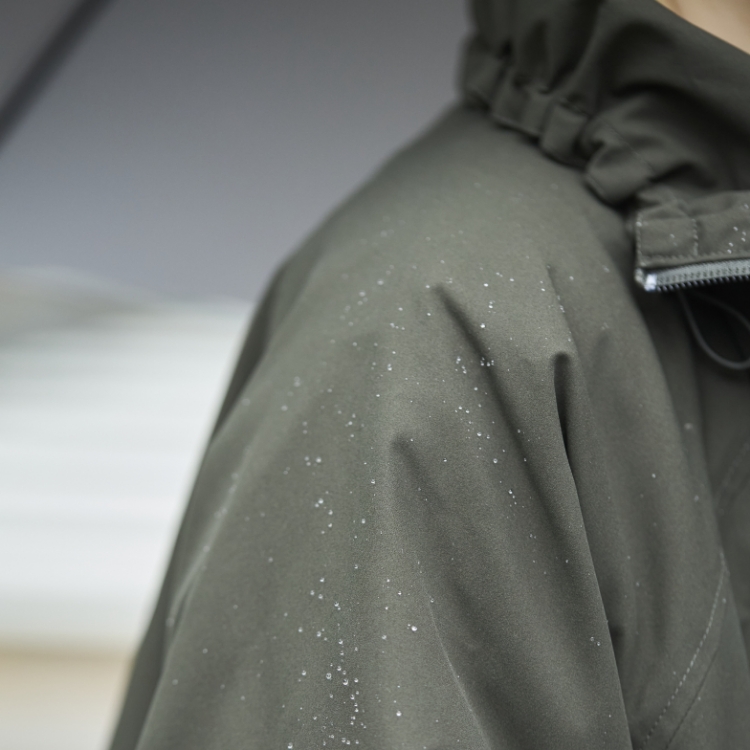フロント部分をジップアップで開閉できるようにし、襟は口まで覆うことができるスタンドカラーにしています。襟と裾の部分はドローコードがついていて、シルエットが変えられるのがいいところ。