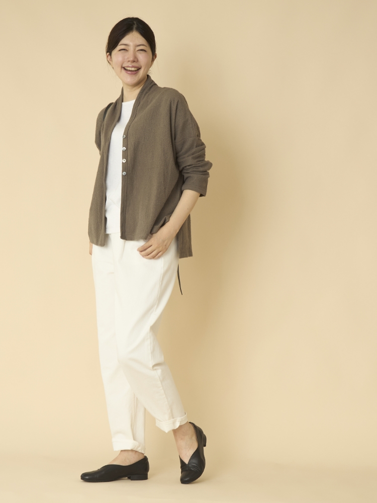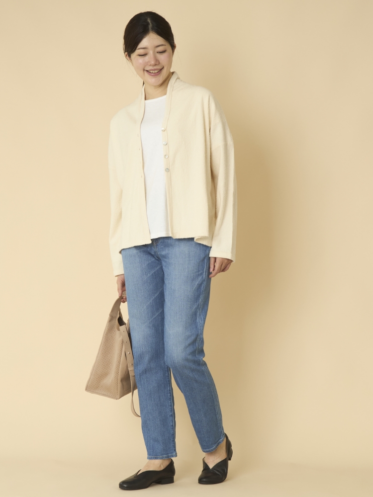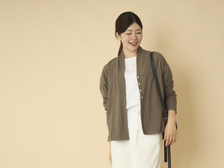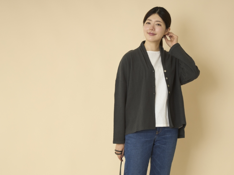 こちらのカーディガンは表面がボコボコとしたパイル生地を使用。生地選びにこだわりを持つブランドが手掛けているだけあって、シンプルな形でも、ほかとは違う雰囲気です。季節の変わり目などアウターに悩む時期にも、1枚着るだけでサマになるのも嬉しいところ。表は凹凸感のある生地ですが、裏側はなめらかなので、重ね着してももたつかないと思います。