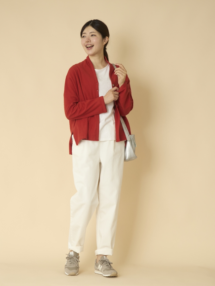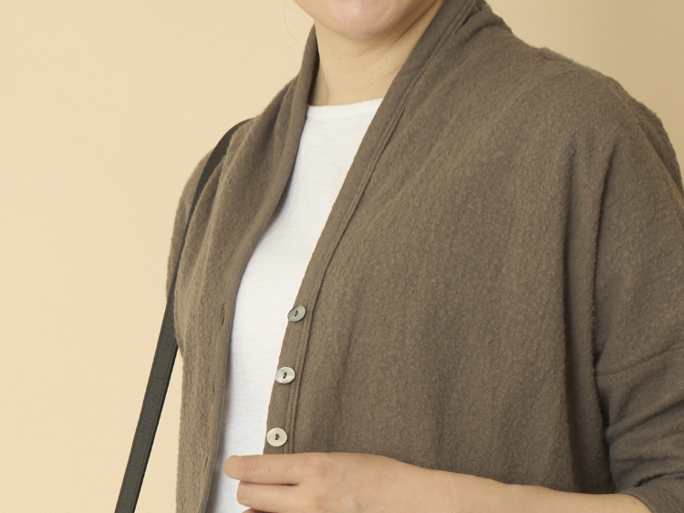 こちらのカーディガンはショールカラーと呼ばれる衿を採用。首元を包み込むようなデザインで防寒性も高いので、別に巻物を持つ必要がありません。また年齢の出やすい首の後ろの丸みもさりげなくカバーできるのもポイント。