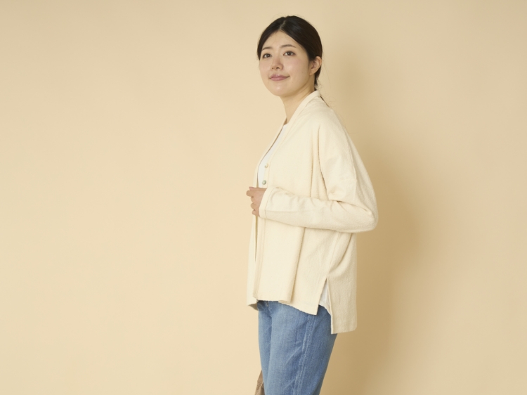 こちらのカーディガンは大人の女性の体のお悩みを解決するために考えられたデザイン。袖はゆったりとしたドロップショルダーで、肩のラインを丸くソフトな印象にしています。